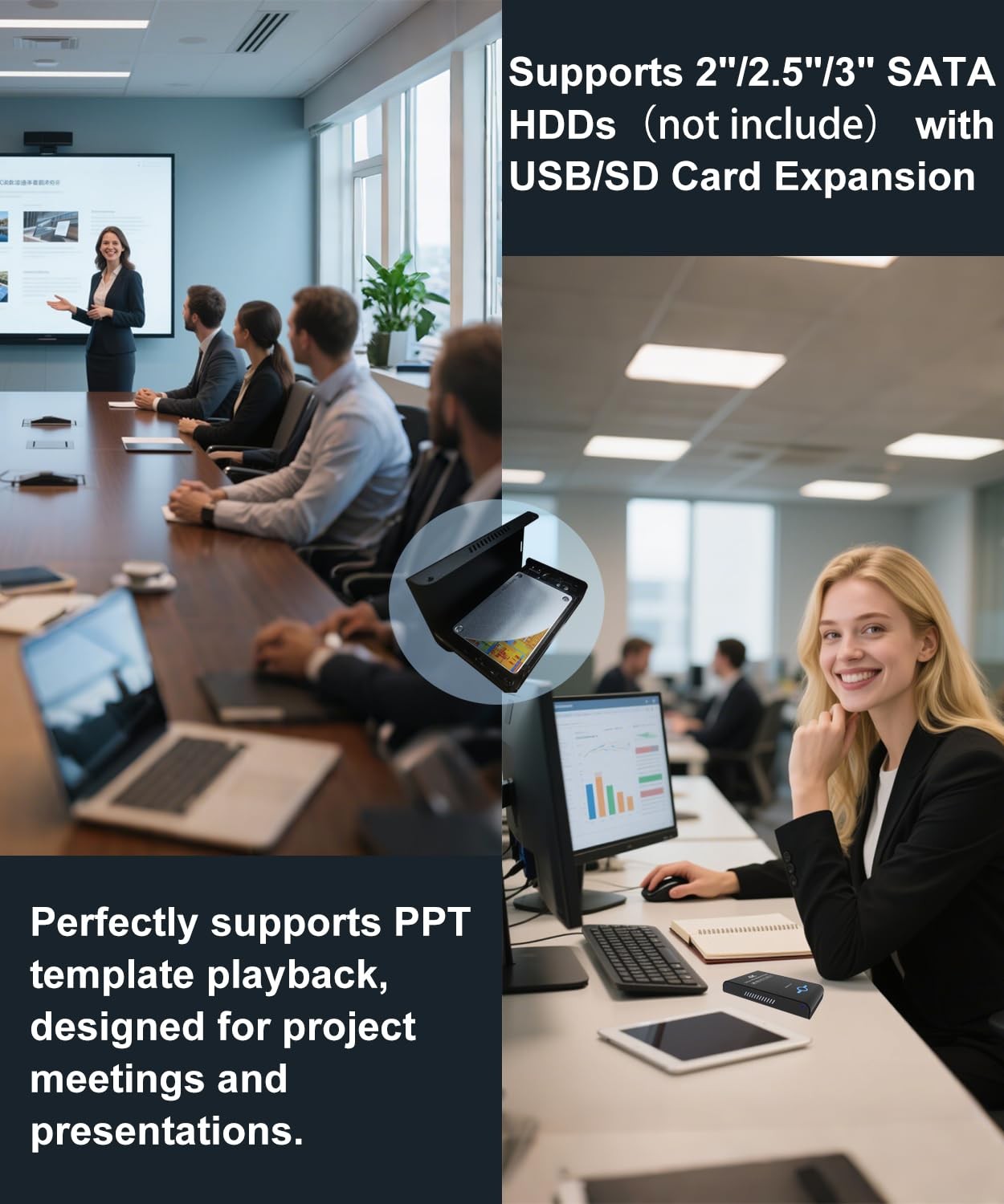 - Digital signage features: Auto start, auto play, auto loop, auto resume, configurable 90/180/270° rotation and full subtitle control — perfect for restaurant menu boards, lobby displays, in‑store marketing and museum installations.